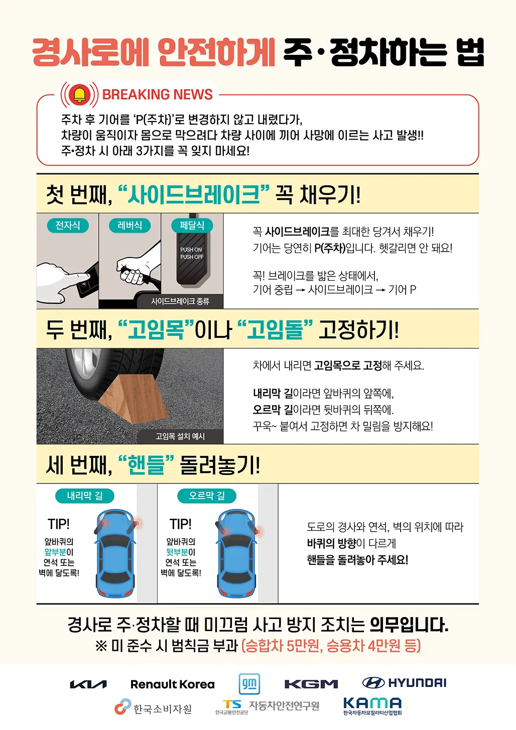 2020년 "하준이법" 시행 이후에도 경사로 교통사고가 지속됨에 따라 한국소비자원과 TS(자동차안전연구원)은 자동차사업자정례협의체와 협력해 '경사로 주정차 안전사고 예방' 공동캠페인을 실시합니다.