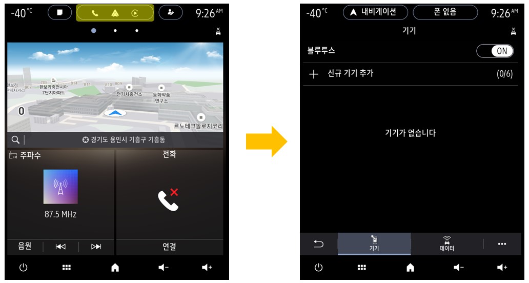 - 이미 연결된 기기가 있으면 애플 카플레이 또는 안드로이드 오토 화면으로 진입